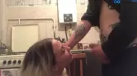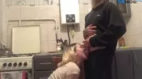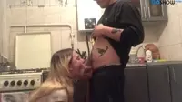 In a dimly lit kitchen, the sultry scene begins to unfold as the blonde woman with a seductive pout, clad in an alluring black lingerie set, stands confidently against the marble countertop.Her long legs wide apart and her back arched sensually, she invites the muscular man with a dominant presence, clothed only in his underwear that accentuates his chiseled body.The camera zooms in on them as they begin to passionately explore each other, with the man running his skilled hands up and down the woman's toned arms while his lips gracefully caress her erect nipples - an irresistible combination of hunger and tenderness that drives their desires even further.As the heat rises between them, the woman slides down to her knees with unwavering eagerness, wrapping her luscious red lips around his cock with unmatched proficiency.The man groans deeply as the woman's blowjob skills take hold, showcasing her prowess as a cocksucker, using her tongue and mouth in perfect synchrony to satisfy the erection between her lips.The passion escalates further as she sucks on the engorged head before taking him all the way down, feeling the warmth and pulsating veins throbbing against her throat.With both of them drowning in sexual tension, another man enters the room, a picture of absolute lust.He wears nothing but leather gloves, an erect cock ring, and a smirk that says he's eager to join in on the fun.Approaching the couple with intention, he slides his gloved hand under her skirt and begins to finger her while simultaneously sucking on her other nipple, driving her blonde head even closer into the man's crotch.Their moans grow louder and more desperate as each touch brings them to the edge of ecstasy, creating a dynamic that is both powerful and vulnerable at once.The dominant man positions the woman against the cold marble countertop, her ass high in the air while his strong hands grip her hips.He enters her from behind in an aggressive kitchen counter style, setting the scene ablaze with their animalistic desire.The second man, now fully clothed and just as horny, steps up beside them, ready to make use of the woman's mouth and dripping pussy for his pleasure.The heat escalates, every thrust and lick intensifying the experience.Each groan, moan, and pant becomes more desperate as they seek release, yearning for the orgasm that awaits at the end.With each passing moment, it's evident just how skilled these two men are at satisfying their woman - her moans growing louder and her body shaking from pleasure, leaving no doubt in anyone's mind about the true extent of this kitchen countertop fuckfest.
